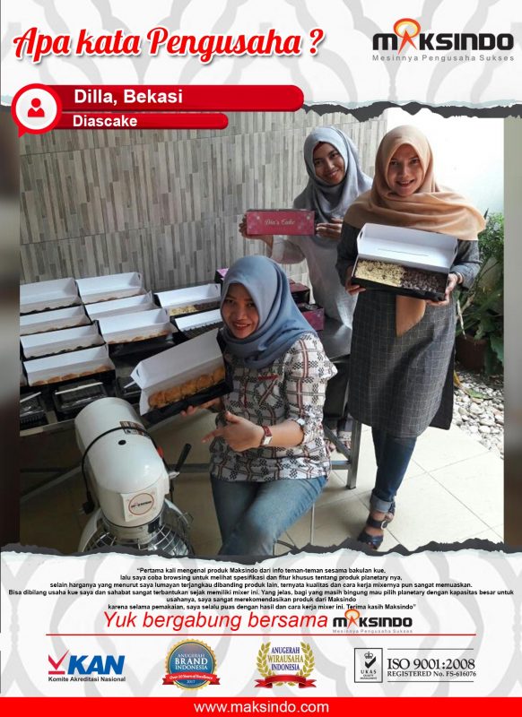 Dilla merupakan salah satu pengusaha bekery di Kota Bekasi. Usaha bakery yang ia jalankan diberi nama bran yaitu Diascake. Untuk mendukung proses produksi Ibu Dilla memilih untuk menggunakan mesin Mixer Planetary. Dengan adanya mesin mixer planetary yang digunakan proses pembuatan roti menjadi semakin lebih mudah .