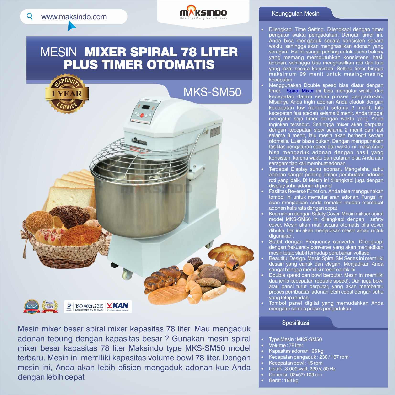 Mesin Mixer Spiral 78 Liter Plus Timer Otomatis MKS-SM50 adalah mesin usaha bakery yang membantu proses pembuatan adonan dengan efisien dan cepat karena memiliki kapasitas 50 liter.