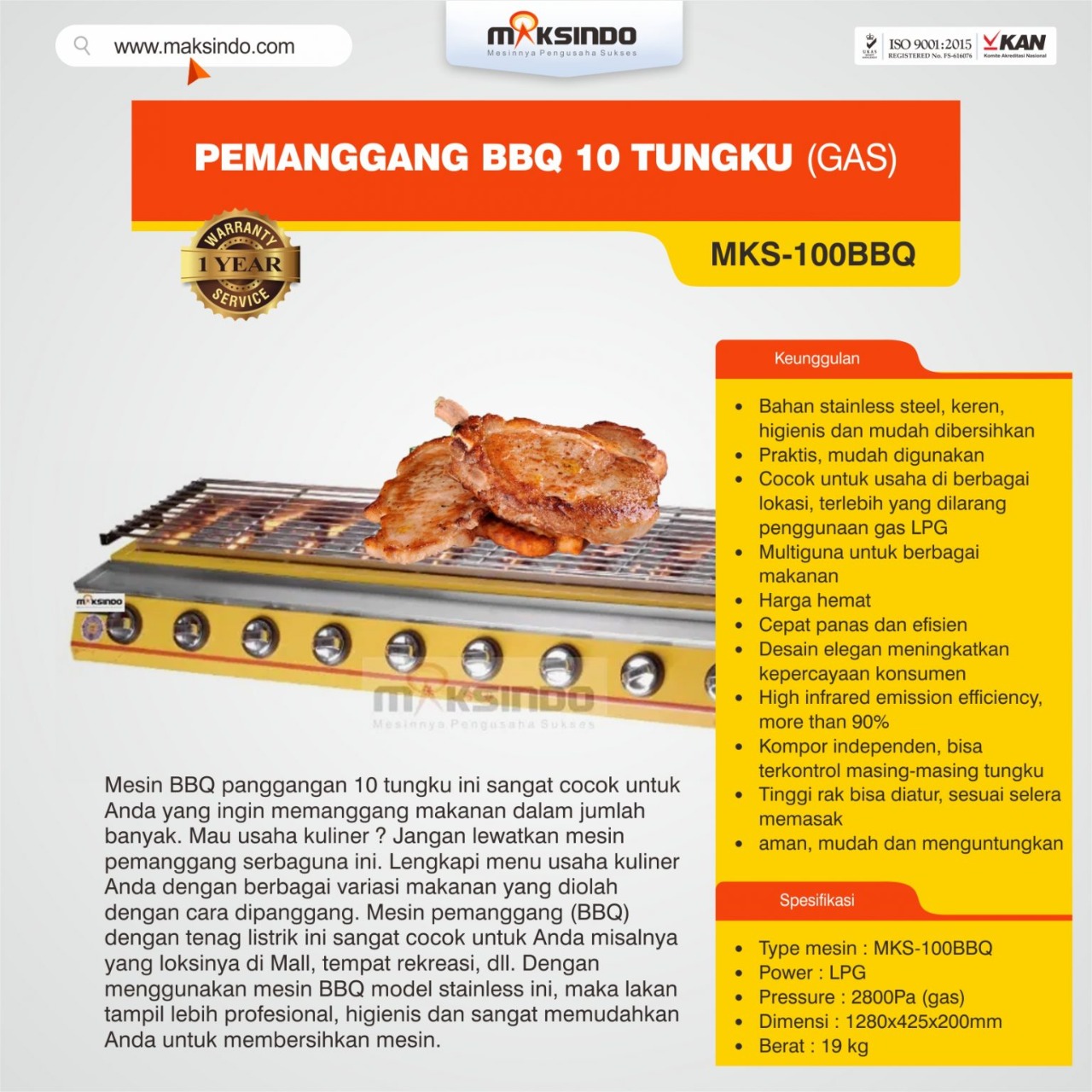 Mesin pemanggang BBQ model MKS-100BBQ dari Maksindo untuk memanggang beragam makanan mulai daging ayam, steak, daging sapi, iga, roti bakar dan aneka bahan lainnya. Mesin ini sangat pas untuk dimanfaatkan dalam semua skala bisnis makanan. Salah satu kelebihan yang akan Anda dapatkan apabila Anda mengimplikasikan mesin ini ialah dapat mendapatkan hasil bakaran yang sempurna yang pastinya menambah cita rasa makanan Anda menjadi terasa enak. Mesin ini mempunyai bahan stainless steel dan juga mempunyai tampilan yang menarik. Dengan 10 tungku pemanggang Anda bisa memanggang bahan makanan lebih banyak. Jika Anda lebih untung dalam bisnis kuliner segera gunakan mesin pemanggang dari Maksindo ini.