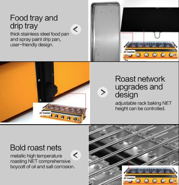 Aplikasi Mesin untuk memanggang aneka makanan : memanggang sate, ikan, daging, jagung, sosis, ayam, dan apapun makanan yang Anda ingin panggang atau bakar